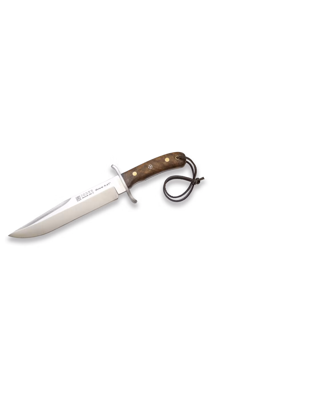 Klassisk jakt- och friluftskniv i bowiemodell. Med sitt ikoniska bowieblad, robusta konstruktion och eleganta valnötshandtag är detta ett mångsidigt verktyg som hanterar allt från grövre arbeten i vildmarken till finare skärmoment. Bladet är tillverkat i slitstarkt N695 rostfritt stål med en härdning på 55–57 HRC, vilket ger långvarig skärpa och motståndskraft mot slitage och korrosion. Den karakteristiska clip point-formen ger kraft och precision, vilket gör kniven idealisk för rensning av vilt, täljning, kapning och annat praktiskt arbete. Handtaget i vacker valnöt ger ett bekvämt och säkert grepp även vid längre användning. Träets naturliga struktur gör varje kniv unik, medan det rostfria fingerskyddet ger extra säkerhet vid användning. Med det medföljande bruna läderfodralet bär du kniven på bältet eller utrustningen.