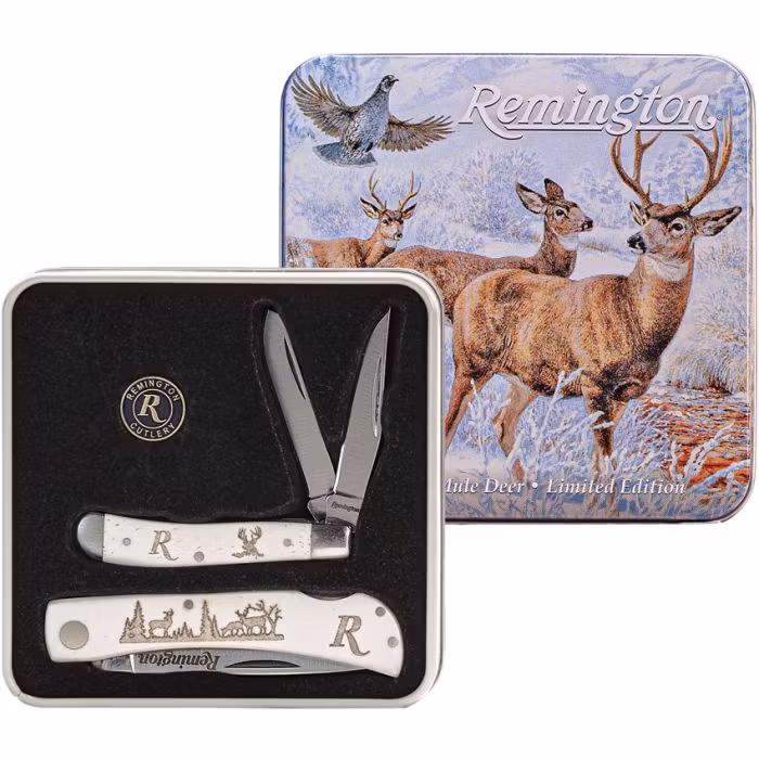 Prisvärda fällknivar i ett set från Remington. Med tillhörande plåtlåda där knivarna förvaras.Fällknivar set om 2 vackra fällknivar i tillhörande fin plåtlåda f