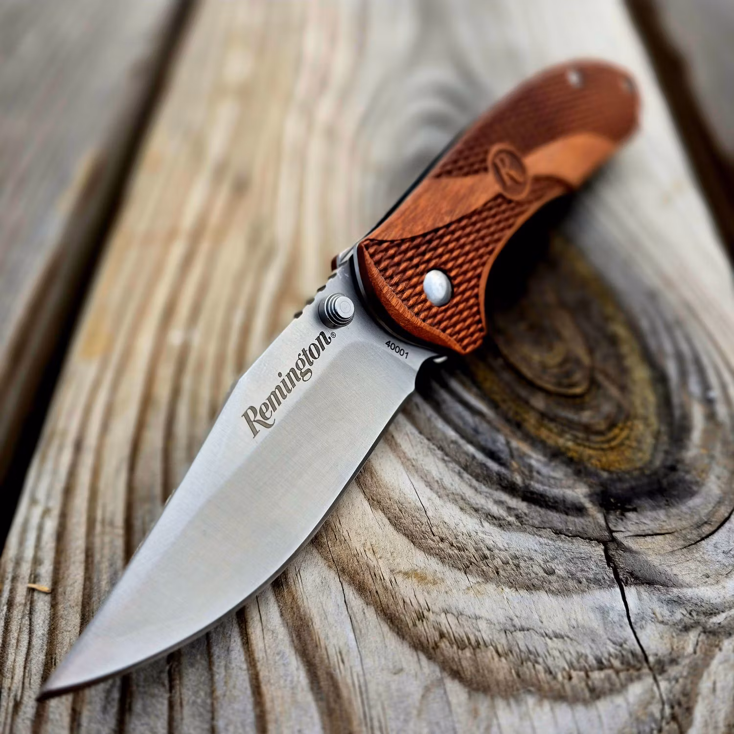 Prisvärd fällkniv med trä handtag från Remington för jakt och fritid.1. Elegant trähandtag:Handtaget är tillverkat av fint trä, , vilket ger kniven en rust